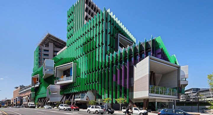 Podemos ver entre la fachada de color verde además del estilo de sus paneles que hacen que filtren más claridad y darle un aire más natural, todo lo tiene estratégicamente diseñado para que cuando entres al hospital veas bien los letreros y para que cuando se asome veas unas buenas vistas como el río Brisbane que se ven algunas habitaciones y es que es importante disponer de un buen paisaje.